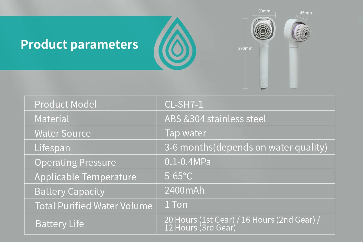 Produktmerkmale: 5 Stufen Filtration Einfache Installation Sanftes Duscherlebnis nahrhafte Dusche Parameter Produktmodell: CL-SH20 Werkstoff: ABS PP Wasserquelle: Leitungswasser Lebensdauer: 3-6 Monate (abhängig von der Wasserqualität) Betriebsdruck:...